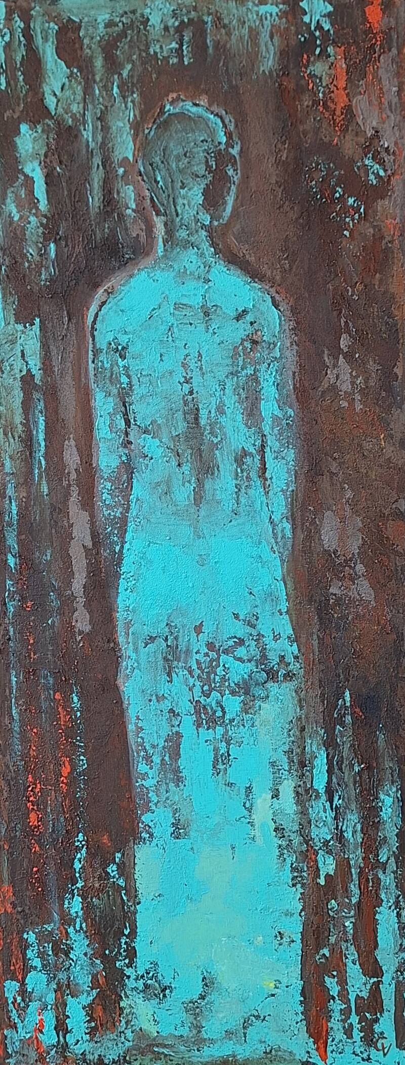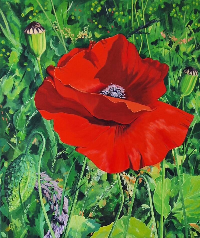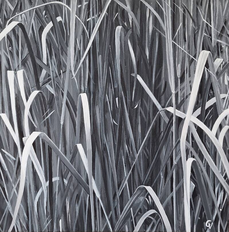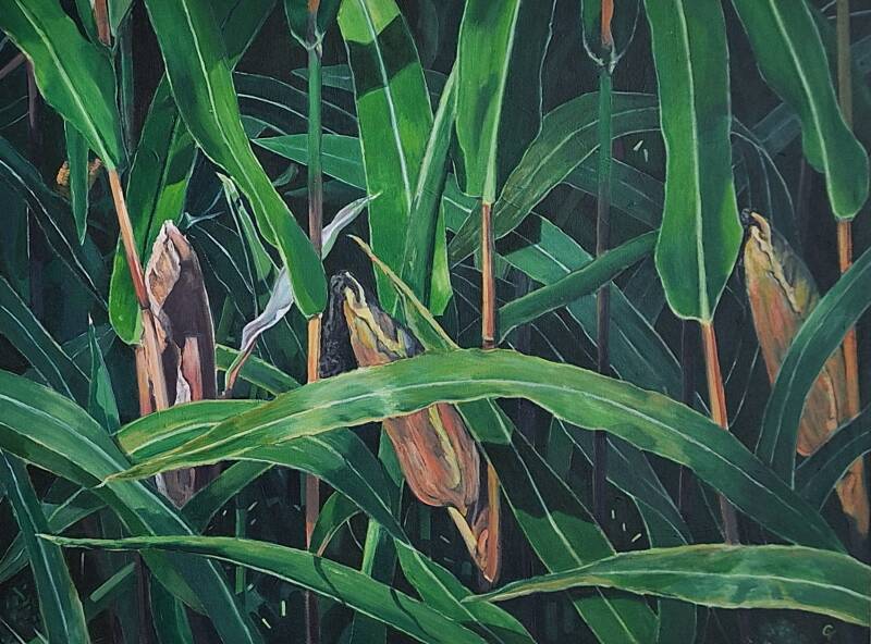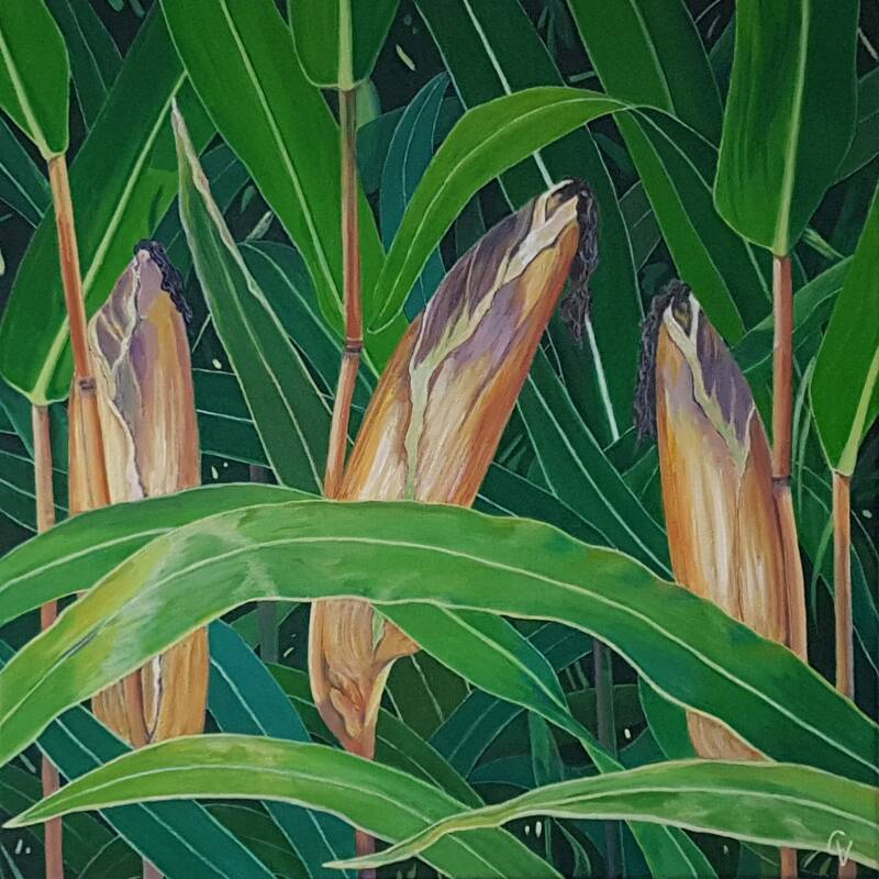 Tijdens mijn wandelingen over Wieringen heb ik verschillende keren foto's gemaakt van maïsplanten. Soms wuivend in de wind, soms stil in de brandende zon. Daarna thuis op het doek orde scheppen in de chaos van al die vormen en kleuren. Hetzelfde heb ik gedaan met tarwe. Acrylverf.